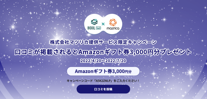 株式会社マツリカ(本社:東京都中央区、代表取締役CEO:黒佐英司)、スマートキャンプ株式会社(本社:東京都港区、代表取締役会長:古橋 智史 以下、スマートキャンプ)は、スマートキャンプが運営するSaaS比較サイト「BOXIL(ボクシル)」にて口コミ投稿をすると、1件につき3,000円のAmazonギフト券が当たるキャンペーンを、2022年4月20日から7月20日まで実施します。