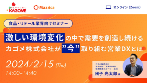 株式会社マツリカ(本社:東京都千代田区、代表取締役CEO:黒佐英司)の提供するクラウド営業支援ツール「Mazrica Sales(旧Senses)」が、「自然を、おいしく、楽しく。」をブランドステートメントに掲げる日本の食品・飲料・調味料の大手総合メーカーであるカゴメ株式会社(以下、カゴメ社)に導入されました。これに伴い食品・リテール業界向けに、 業界が ”今” 取り組むべき営業DXについてと題し、課題から導入に至った背景、理想像や展望についてご紹介するセミナーを2月15日14時〜開催いたします。