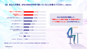 ■SFA/CRM利用の課題、「情報の入力・更新が煩雑」「現場の営業メンバーが情報入力しない」など