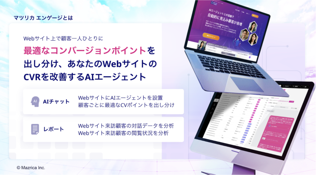 株式会社マツリカ(本社:東京都中央区、代表取締役CEO:黒佐英司、以下「当社」)は、マーケティングAIエージェント「Mazrica Engage(マツリカエンゲージ)」を通じて、AI時代のWebサイト変革を推進していくことを表明いたします。
