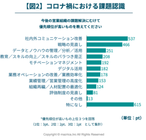 課題解決に向けた取り組み状況について「予定はあるが、まだ具体化していない」32.0%、「保留∕断念」22.9%を合わせて、54.9%が営業組織課題に取り組めておりません。【図1】具体的な課題について聞いてみると【図2】、「社内外コミュニケーション改善」は537ポイント、「戦略の見直し」は466ポイントなのに対し、「特になし」は615ポイントと、課題特定に差があることがわかる結果となりました。課題特定力や解決策の実行力に差が開きつつある傾向があることがわかります。