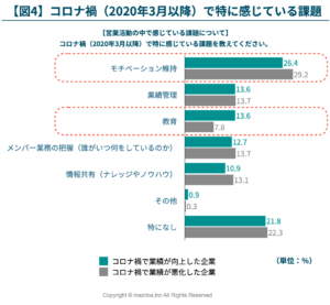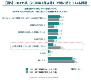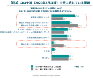 2. 営業活動において、業績が向上した企業では「業務量の逼迫」を課題として認識している一方、業績が悪化した企業では「顧客と連絡が取りづらくなった」という認識が強い