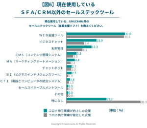 現在使用しているセールステックツールの調査では、業績に関係なく「Web会議ツール」の導入は3割を超えていました。一方、どのツールに関しても業績up群が業績down群より活用が進んでいることがわかりました。【図6】