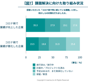 最後に、これらの状況を踏まえて、業績up群と業績down群の、「課題解決に向けた取り組み状況」をみてみます。