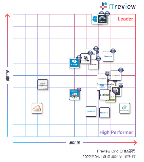 2022年4月に発表された「ITreview Grid Award 2022 Spring」では、ITreviewに集まった約6.5万件のレビューをもとに、顧客満足度と認知度の双方が優れた製品(製品数:4,909件)を「Leader」として表彰、バッジが発行されています。ITreviewのLeaderは、既に多くの利用者から支持を得ている証であり、名誉ある称号とされております。
