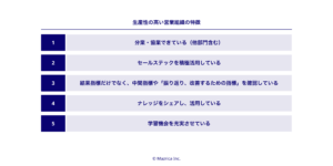本調査は、大企業とスタートアップにおける営業組織について「どちらか一方が優れている」と主張したい訳ではなく、あくまでも「生産性の高い営業組織の特徴を明らかにすること」を試みるものである。そこで大企業・スタートアップにかかわらず、生産性の高い営業組織の特徴を解明するために15の項目について調査を行ったところ、5つの特徴が明らかになった。